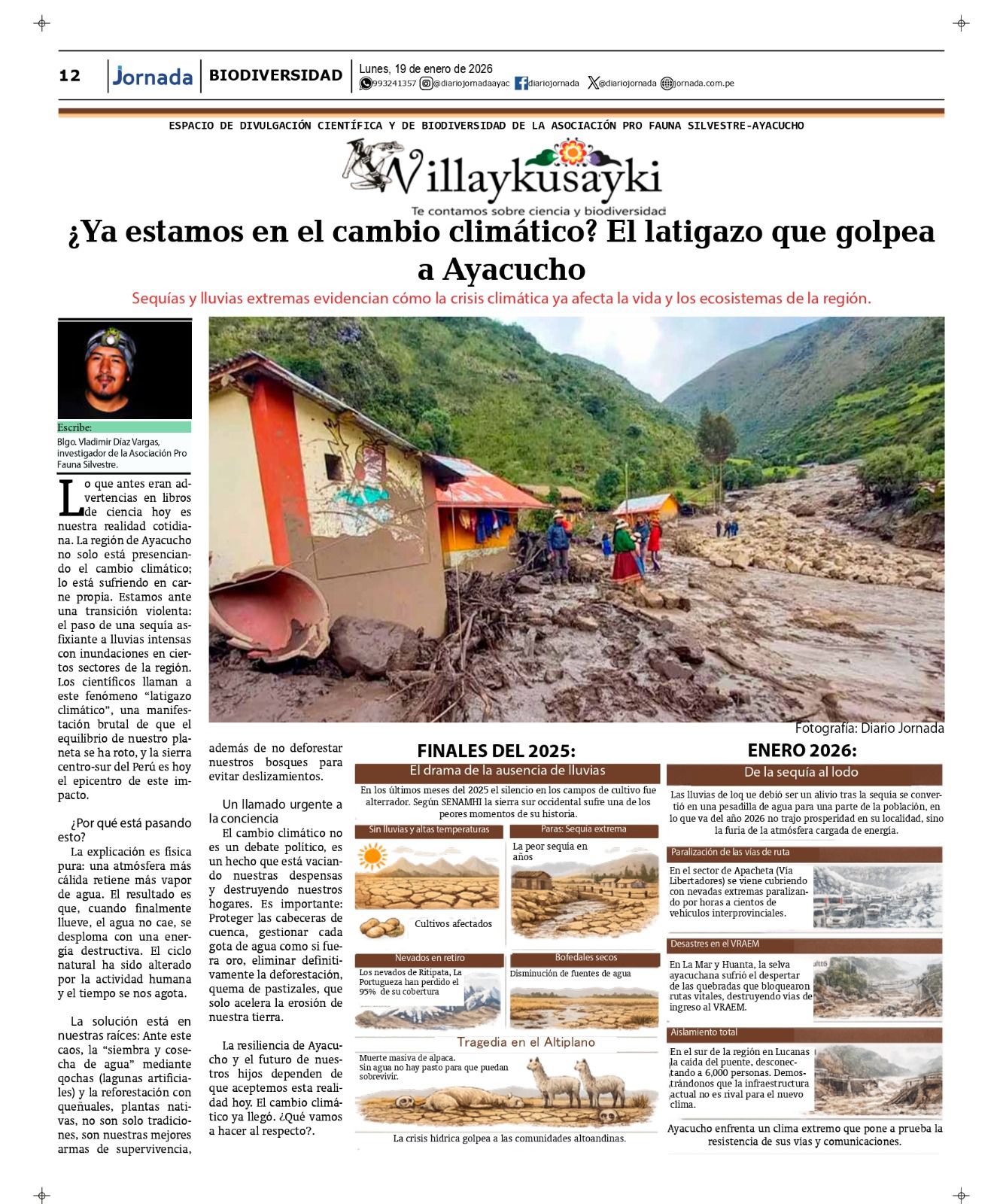 La Asociación Pro Fauna Silvestre impulsa el programa Willaykusayki, dedicado a la difusión de investigaciones científicas sobre conservación de la biodiversidad. A través de notas periodísticas publicadas quincenalmente en el diario local JORNADA y contenidos audiovisuales en redes sociales con su personaje Kuska, el programa acerca el conocimiento científico a la ciudadanía.