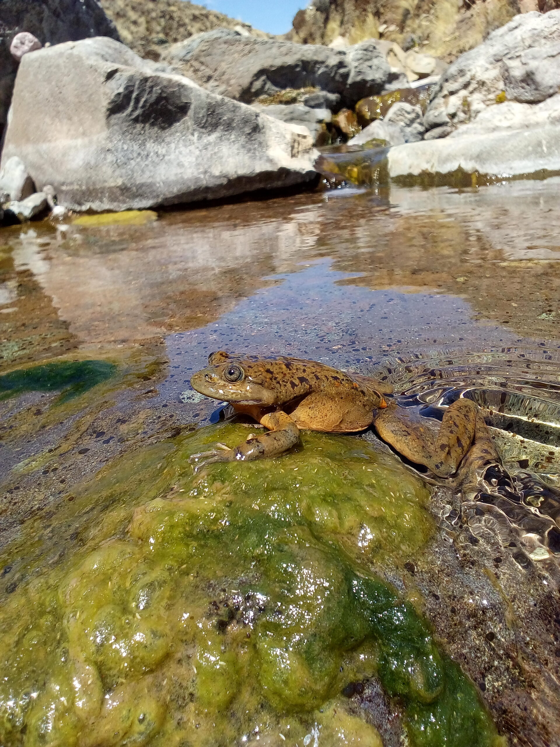 La Rana Dorada de Huancavelica (Telmatobius ventriflavum) es una especie endémica de los Andes peruanos, categorizada por la Lista Roja de la IUCN como En Peligro Crítico, severamente amenazada por la presencia de la trucha arcoíris, una especie exótica invasora que afecta su reproducción y supervivencia. Este proyecto busca proteger sus poblaciones silvestres mediante el control de la trucha y la conservación de su hábitat natural, en estrecha coordinación con la comunidad local.